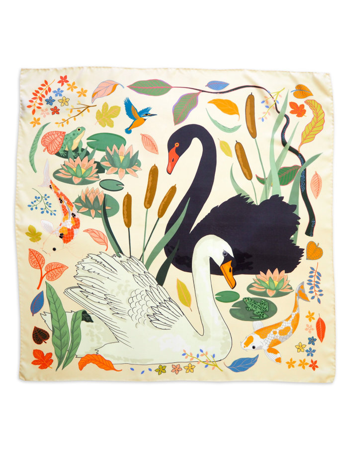 While Karen’ silk scarves are a huge success, her work transfers just as easily onto cushions, ceramics, illustrations, swimwear and pyjamas. There’s a quirky stream of humor in the Scottish artist’s work, which rests somewhere between Hieronymus Bosch and Where’s Wally.
