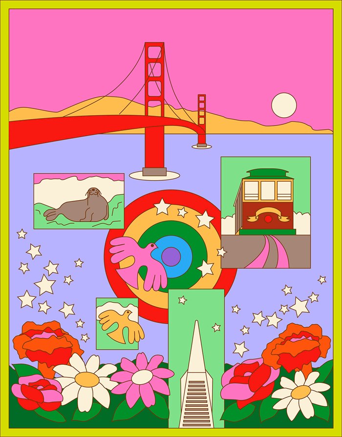 Lin's illustration captures the vibrant essence of San Francisco through a dreamlike composition infused with the spirit of the Summer of Love and Flower Power.