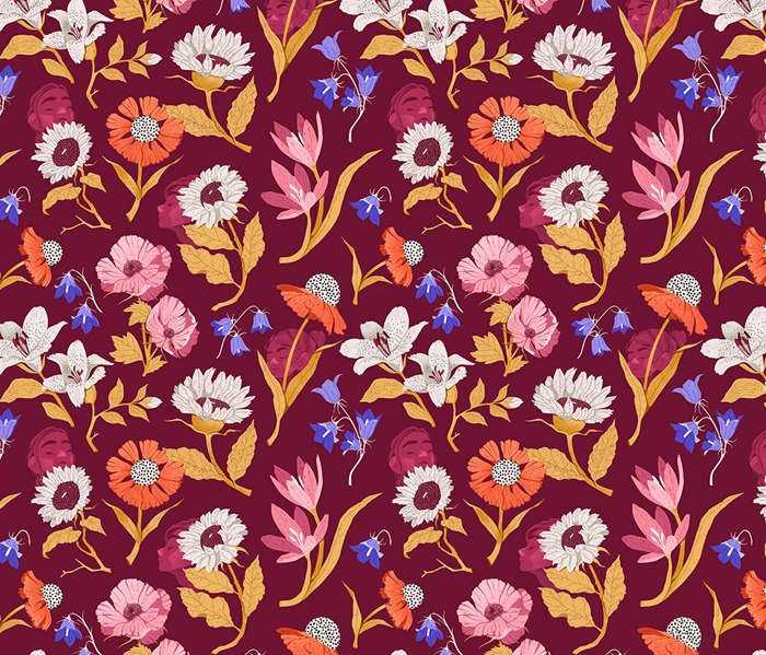 The brief called for a design that felt distinctly feminine - a visual ode to women and their natural strength. Luiza responded with a lush, intricately illustrated pattern, where vibrant florals bloom across a rich burgundy backdrop. Delicate bellflowers, daisies, lilies and wild poppies mingle with subtle faces nestled among the petals, forming a tapestry that’s both elegant and empowering.