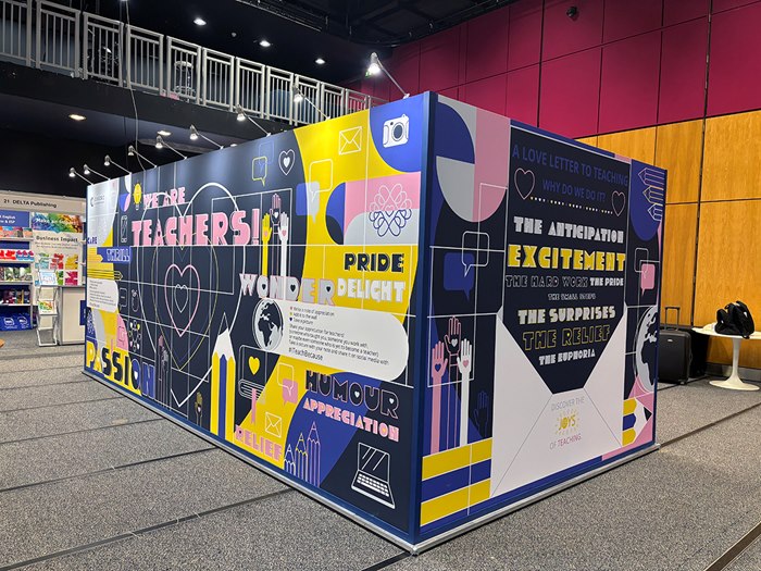 Drawing on OUP’s brand campaign Discover the Joys of Teaching, Tim created a lively collage of custom typography, iconography and international references, all grounded in an optimistic palette. The mural invites engagement - space is left for teachers to add messages throughout the conference - turning the stand into a living, evolving conversation.