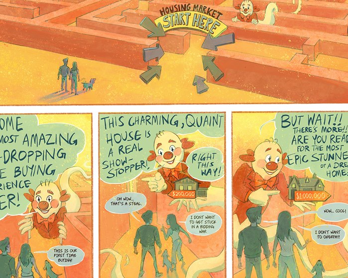 Rendered in a warm palette and expressive, narrative style, the comic captures the uncertainty and stress of making what’s often the biggest financial decision of one’s life—all with a dash of humor and heart.