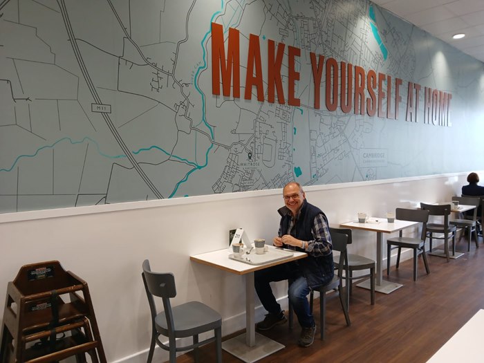 While visiting family near Cambridge, Mark found himself face-to-face with a familiar road - quite literally. The striking wall mural behind him at the Waitrose café in Trumpington is his own creation: a bespoke illustrated map of the local area, commissioned by the supermarket chain last year.