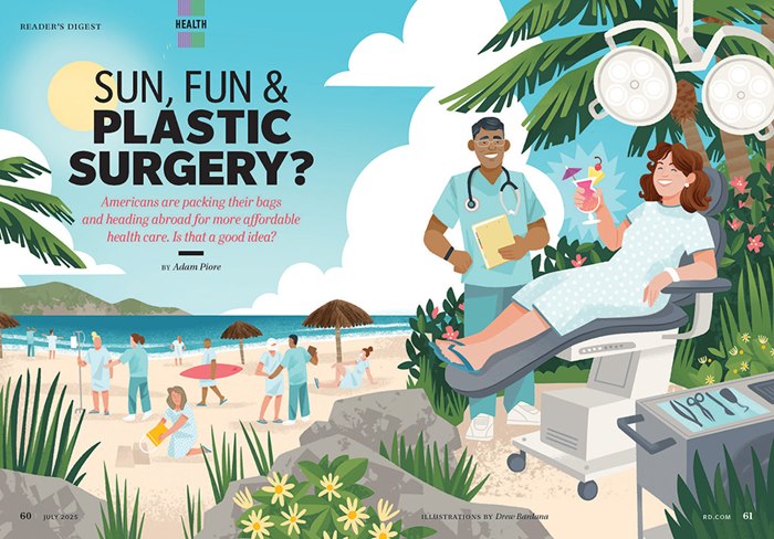 Drew brings humor and sharp observation to the July issue of Reader’s Digest, with a lively visual response to a feature on the booming trend of medical tourism.