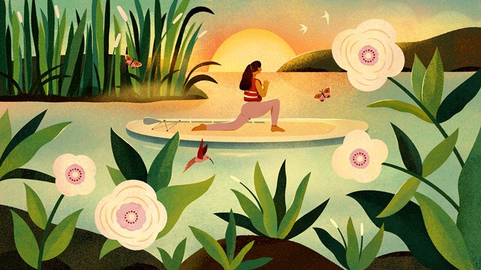 For International Yoga Day, Bárbara's sun-drenched scene captures a figure practising yoga atop a paddleboard, surrounded by lush foliage, flowering plants, and vibrant wildlife - all bathed in the soft golden glow of sunset.
