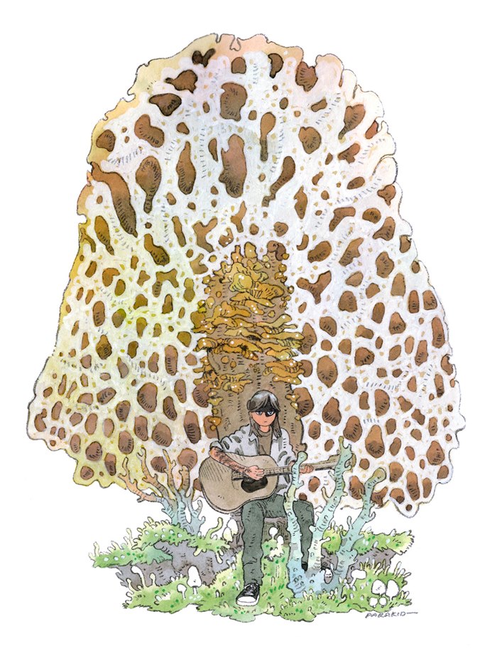 Blending natural textures with human presence, Parakid placed a lone guitarist beneath the towering form of a fantastical fungus, echoing the game’s balance of fragility and resilience.