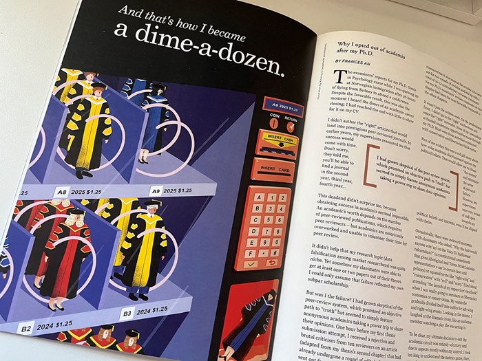 Her illustration reimagines graduates as products in a vending machine - a witty yet unsettling metaphor for the commodification of academic ambition.